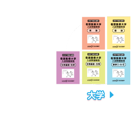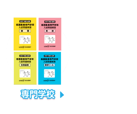 一般選抜・一般入試で出題された問題を収録。専門学校(地区別)、大学(東西)、准看護学校をそろえています